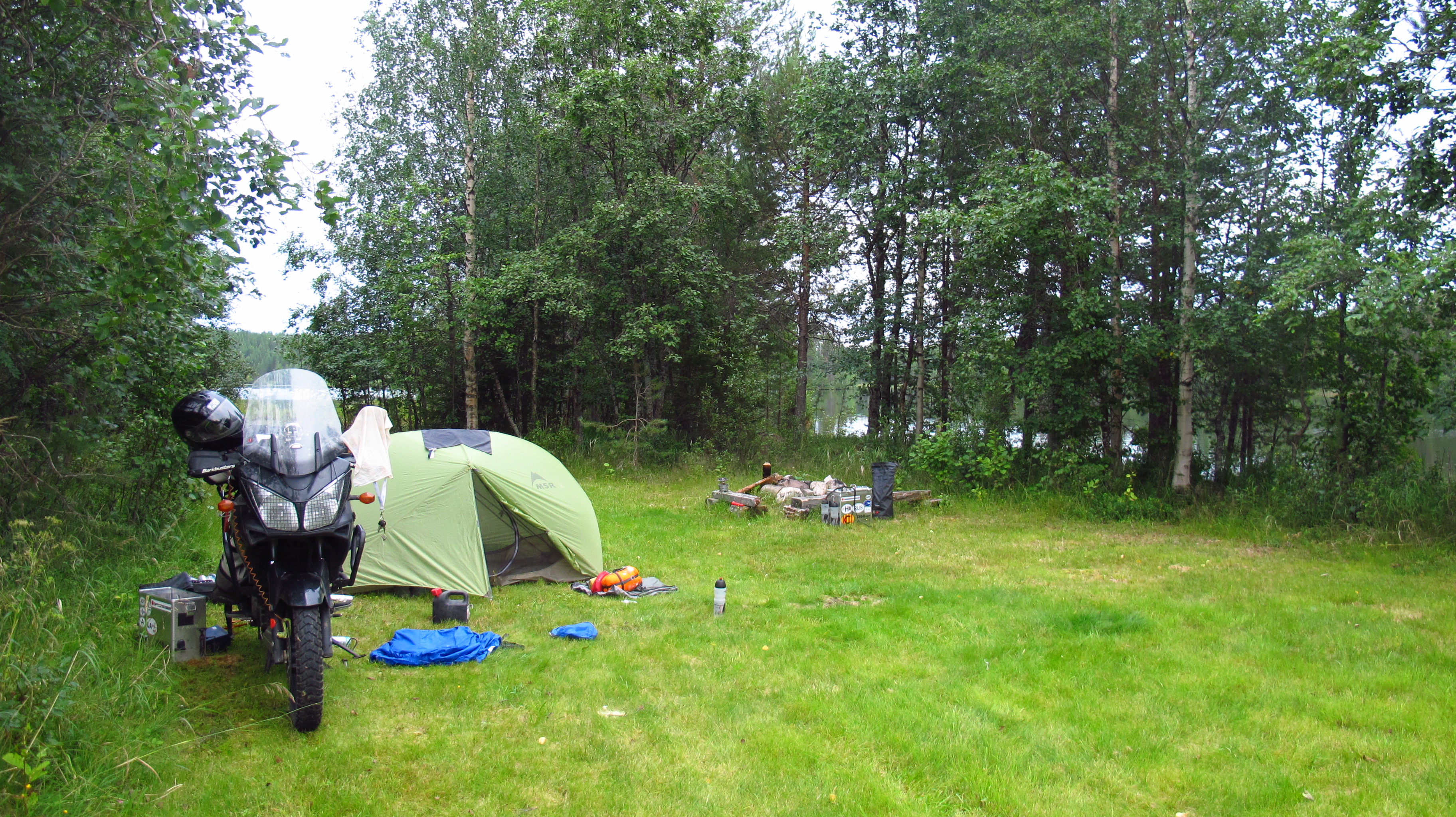 Just before going to bed I was heading down to the lake again to take some pictures, as the sky was a very nice shade of violet with the midnight sun, when I saw a man arrive on a bicycle and stop next to my tent. I noticed that he had something written on his back, and when I got closer to say hi I saw that it said ’10,000km’. I told him that was the distance I had covered so far on my motorbike, and he told me that he was riding around Scandinavia in 8 weeks, doing as much as 260km a day. Or rather a night, as he preferred to ride nights. Or days, as it never gets dark here. Oh well, it is a bit confusing…