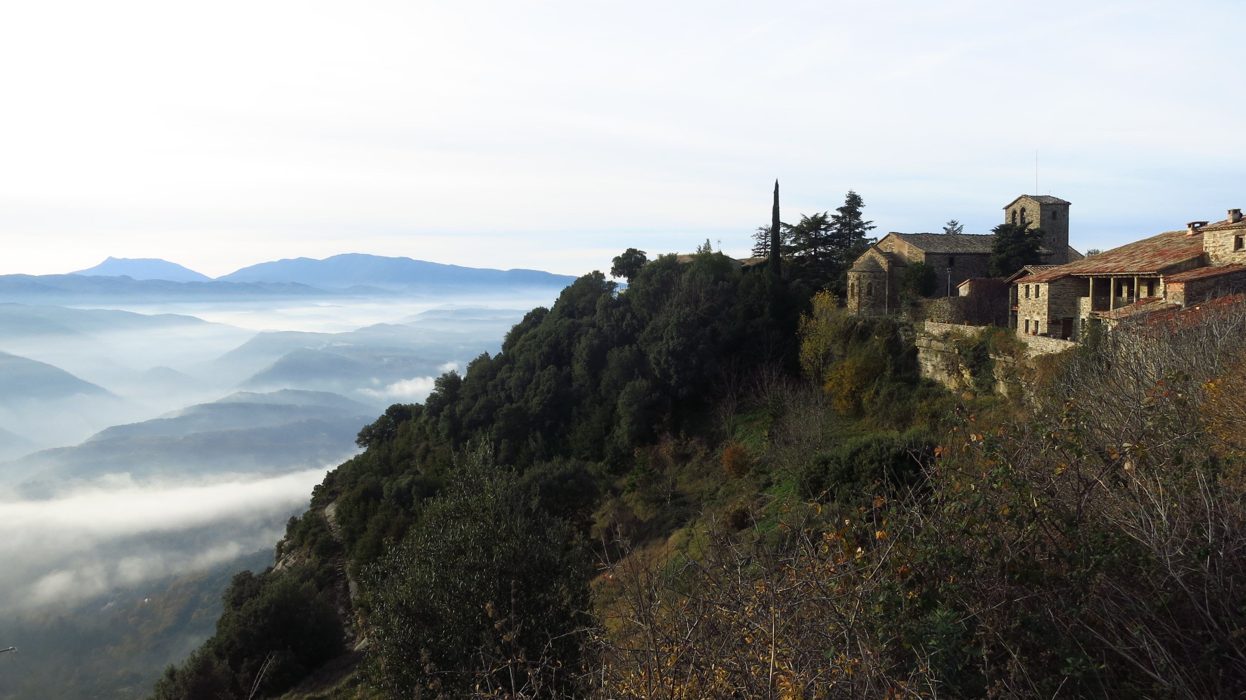 In the nearby village of l’Esquirol we turn right off the main road and take one of my all-time favourite roads – the BV-5207 leading to Tavertet. Even though the road ends there, in good weather there are quite a lot of tourists driving it to get to the quaint village perched atop the cliffs overlooking the Ter valley and the Guilleries mountains beyond, but this early on a winter morning the road is ours. It is half past nine now, we have gained enough height to leave the morning mist behind and the sun shines gloriously over the stunning landscape.