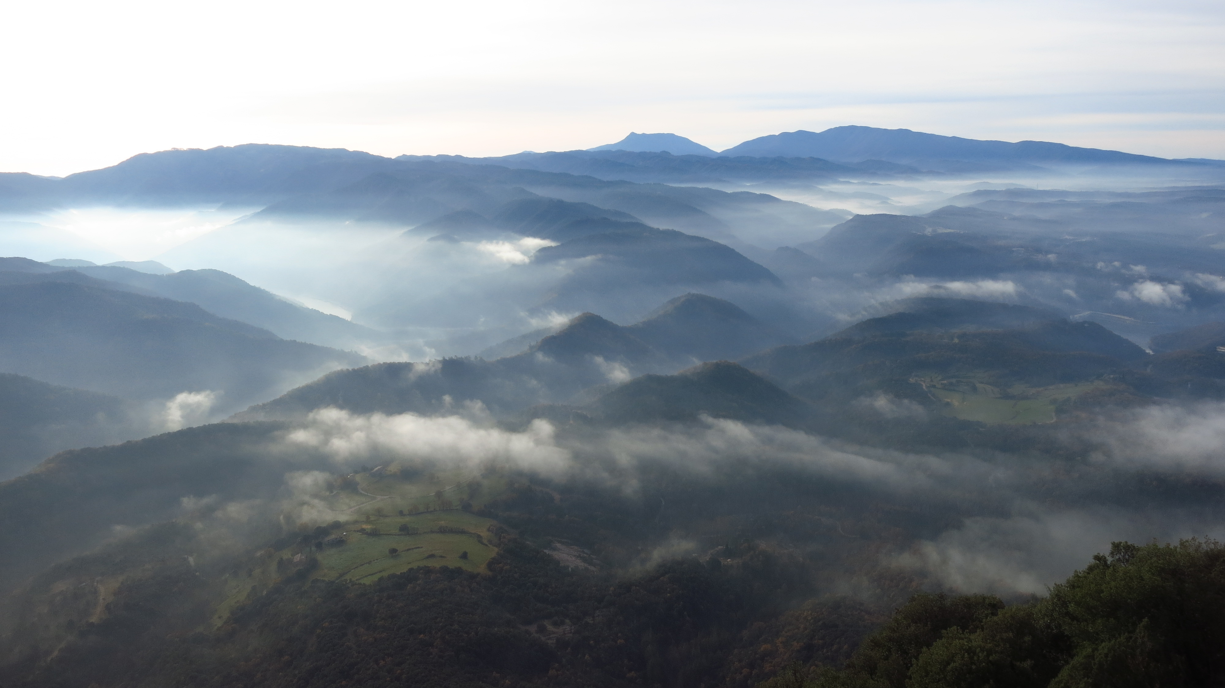 At the entrance of Tavertet we find a boom gate partially blocking the road. It is there only to prevent the numerous tourists who drive up here to enjoy a meal at one of the restaurants from parking inside the tiny village, you can drive around them and keep going to the east side, where a small sealed forest road keeps climbing along the edge of the cliffs to a plain from which the Pyrenees are visible in the distance. The views from up here are magnificent, in a few hundred meters of road one can enjoy an almost 360º panorama of the main mountains in Catalonia – Pedraforca, Guilleries, Montseny, Pyrenees…