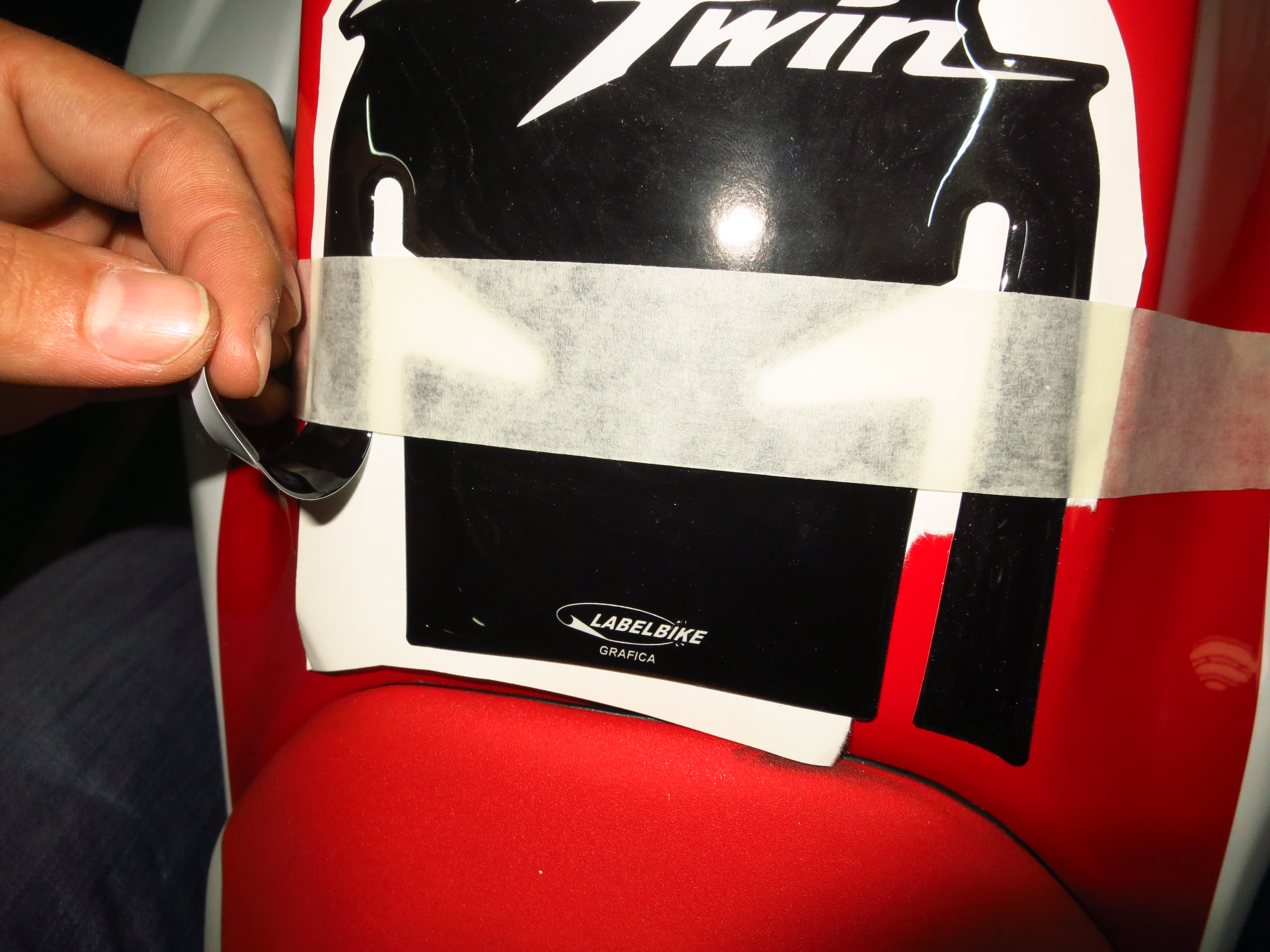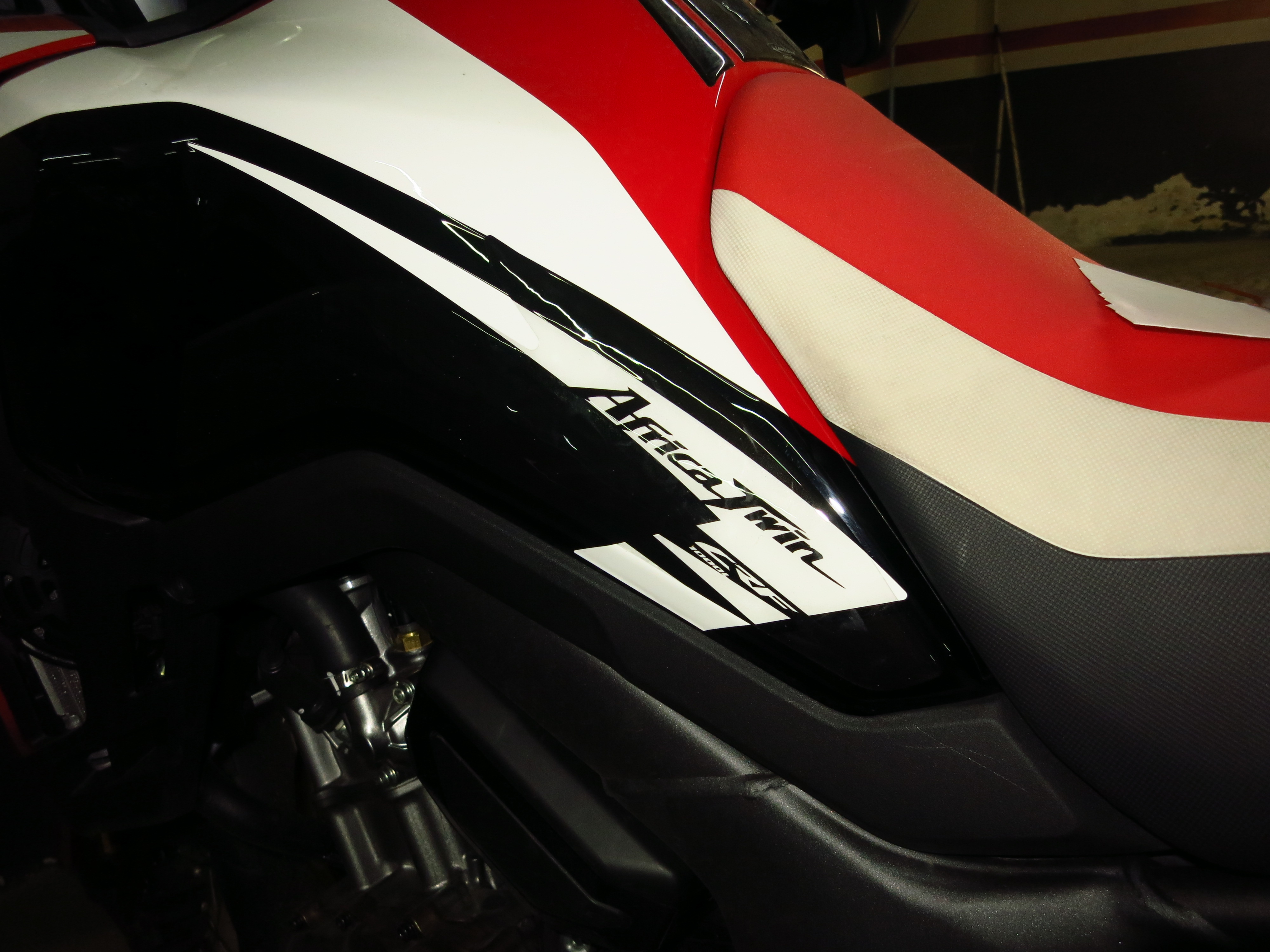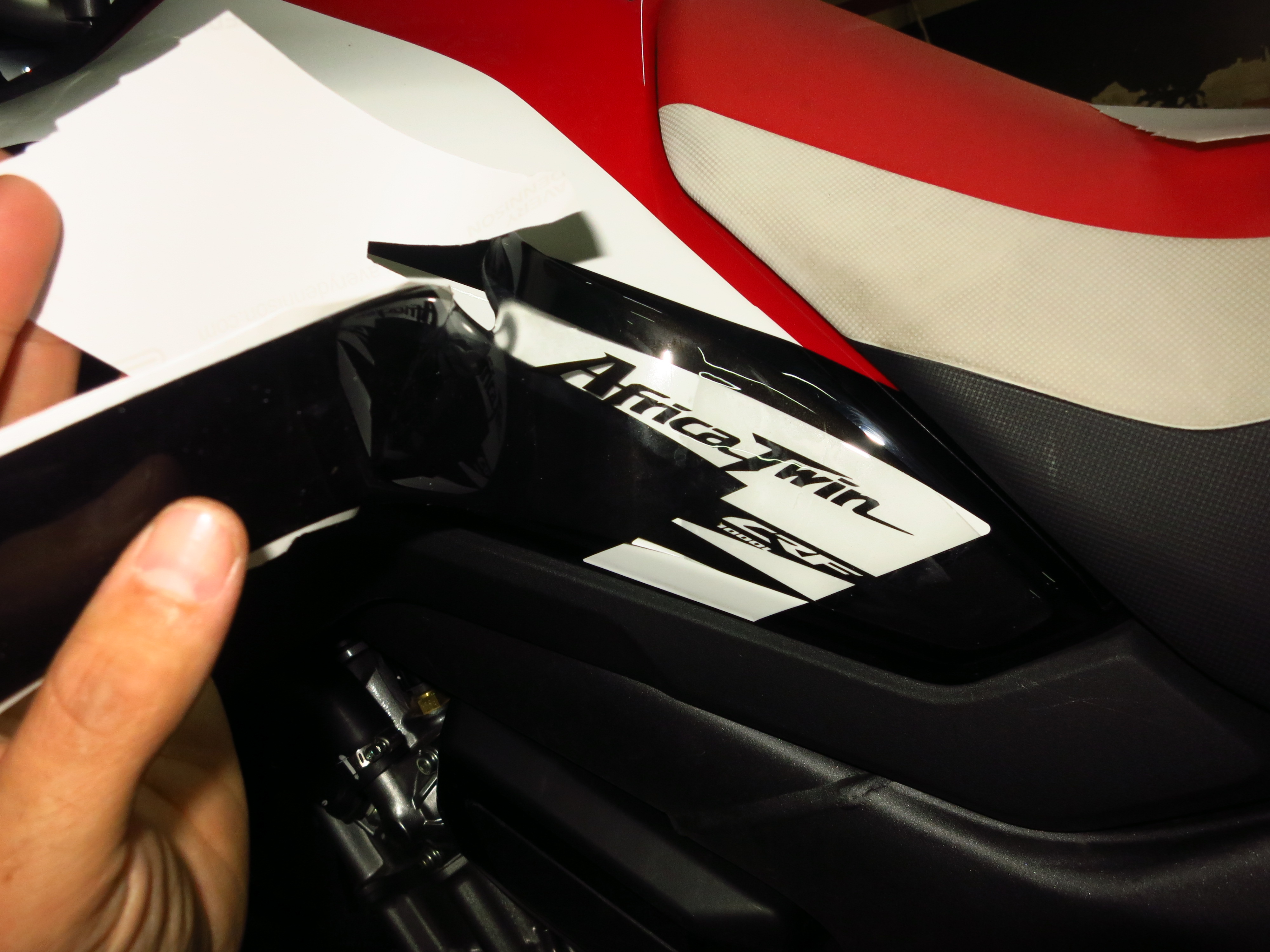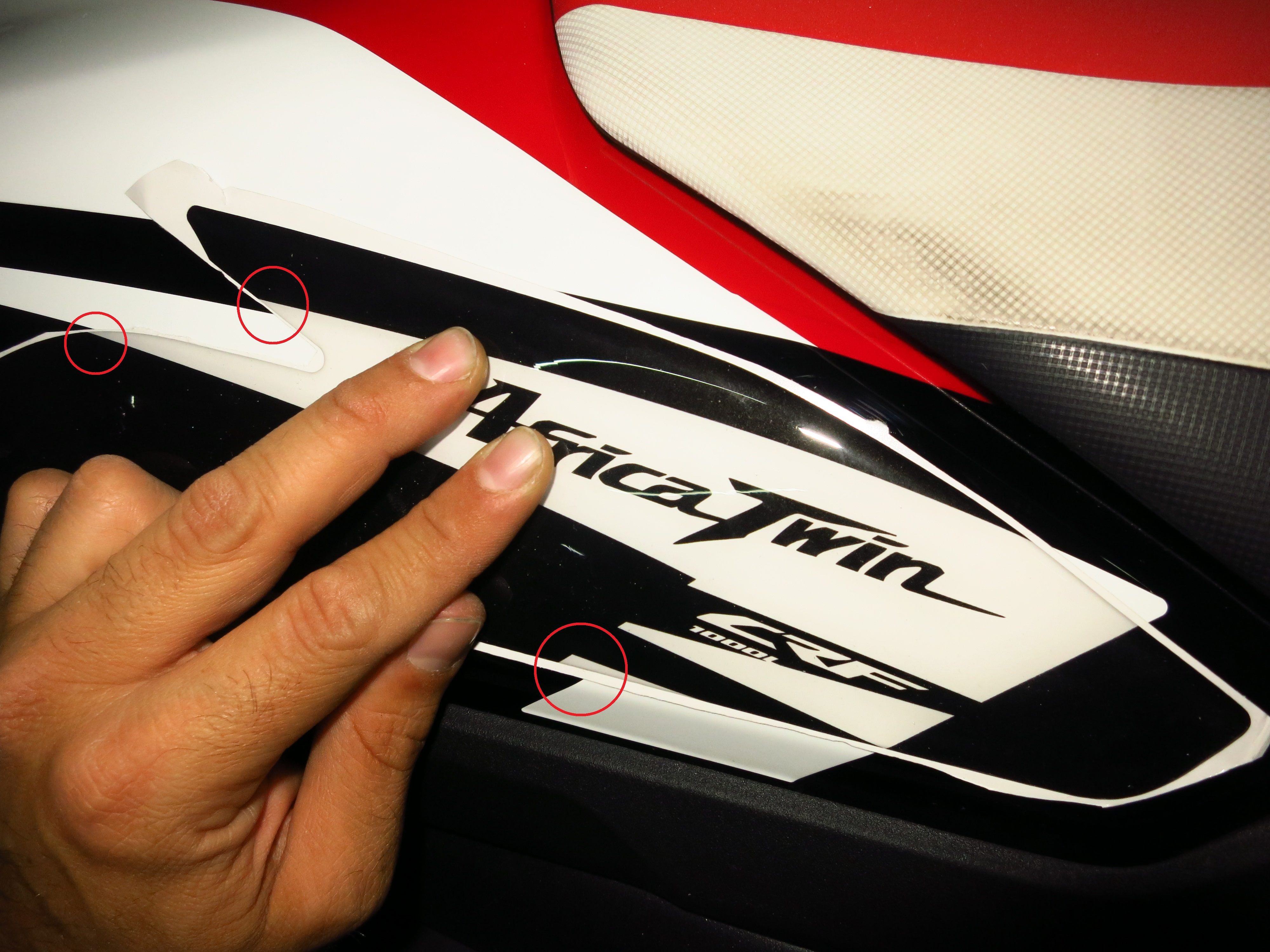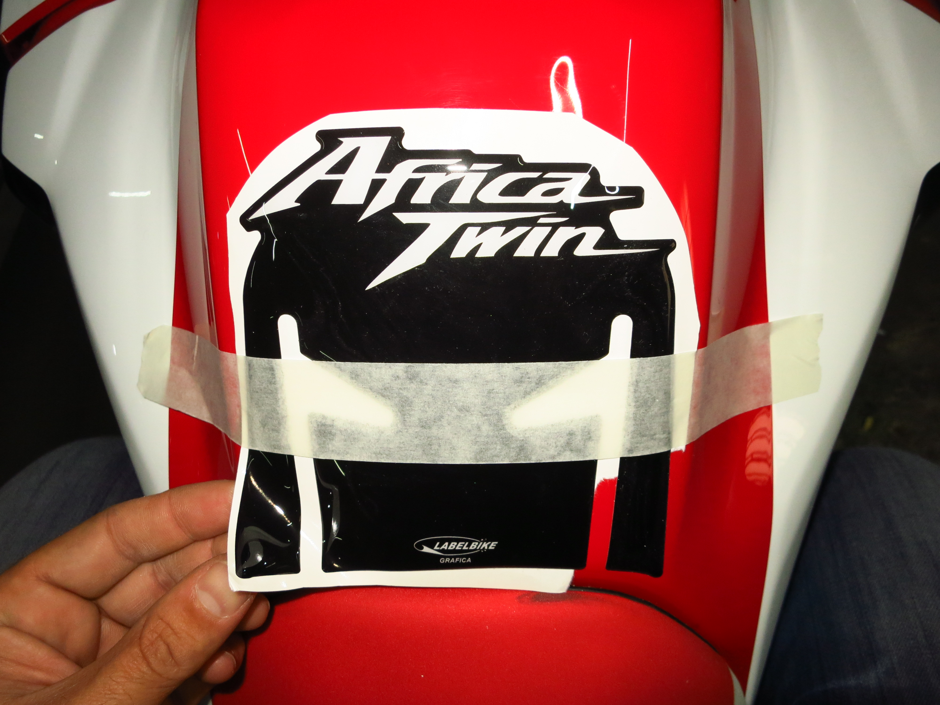 Things did not look so good when it came to putting them on the tank, however. These stickers are designed specifically for the Rally red paint scheme on the AT, the side stickers following the white stripe. When I lined them up against it, I saw that the white stripe on the sticker did not match the one on the bike at several points.