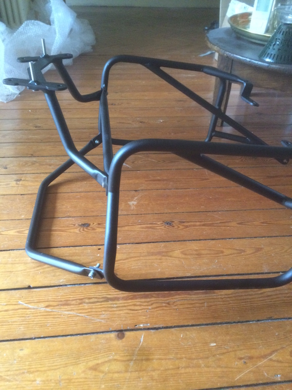 Holan decided to add a reinforcement bar from the top of the loops to the passenger footpeg and forego the rear mounting points. According to them they had tested the system with the technical department of a Polish university and it worked fine. However, with the system on his bike, the forum member I mentioned above was far from happy. He reported that the setup had a lot of flex, even unloaded, and that he would not dare take his bike offroad for fear of the whole thing coming off the bike.