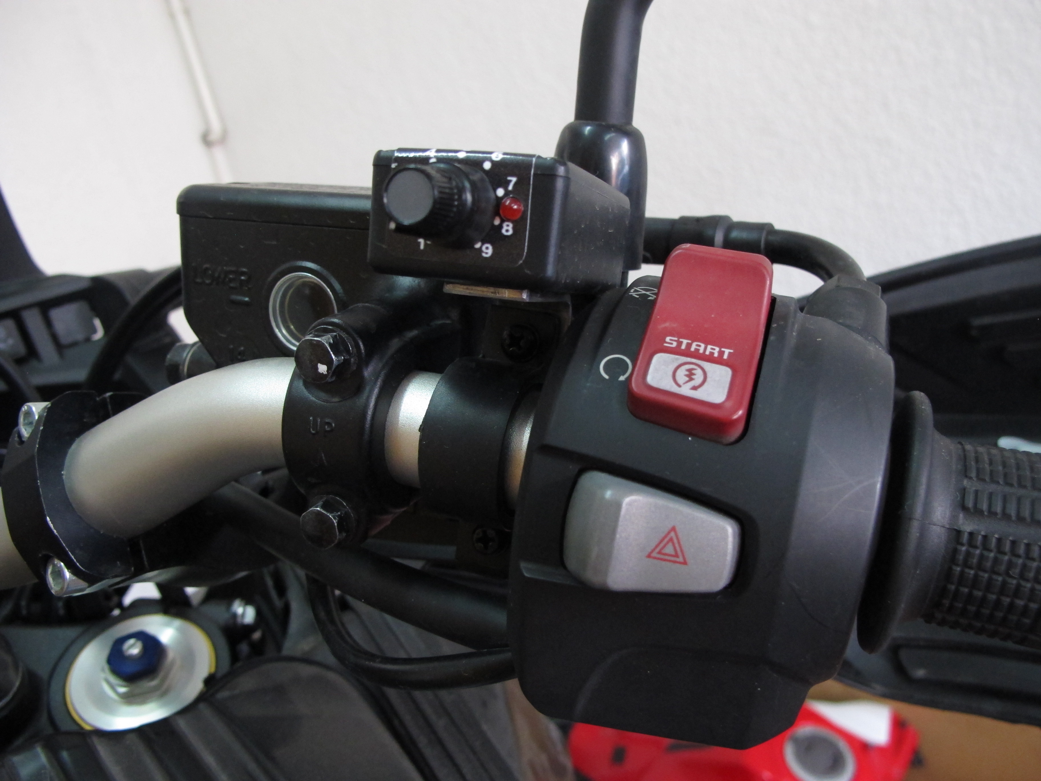 The oiler control unit went on the right handlebar and the fog lamp switches on the left one, in a position I can easily reach with my thumb. I mounted them on a PMR bar switch that replaces the clutch clamp. It looks great, but the bolts did not align exactly with the holes in the clamps, we had to file them off a bit.