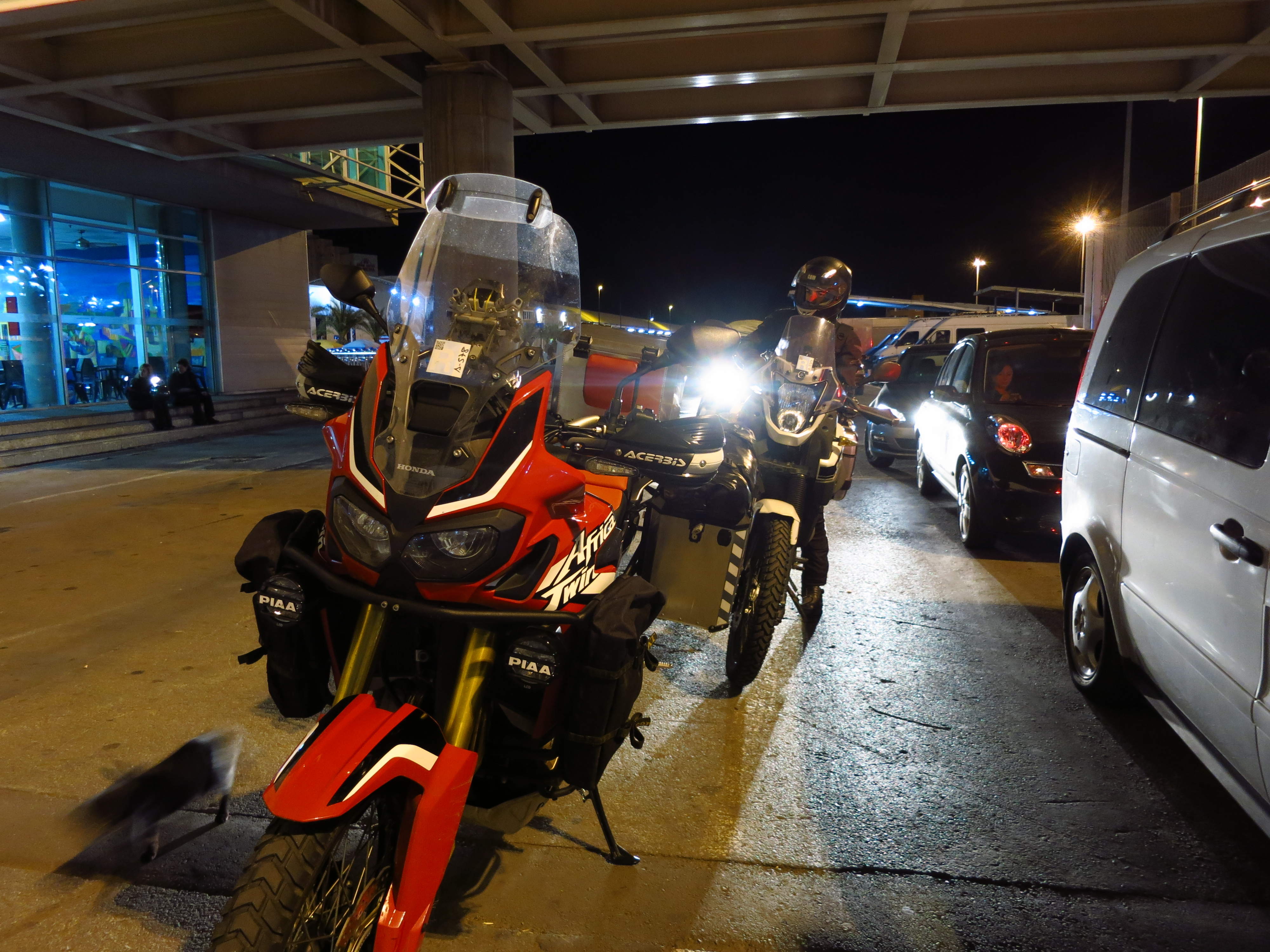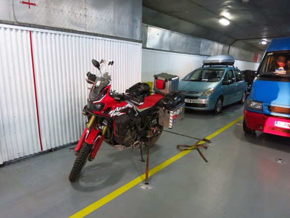 With a sigh of relief, we rode on, only to find that there was yet another checkpoint to cross before the ferry, this time with an employee of the ship company and another customs police officer, checking passports. I had already put mine away, and when I stopped by him and started rummaging in my pockets to get it out he just looked at me, still with my helmet and sunglasses on, and asked ‘are you Spanish?’ in a thick southern accent. ‘Yes’, I replied, and he said ‘OK, go on’. Top notch security here, I got on the ferry without having had my passports checked once.