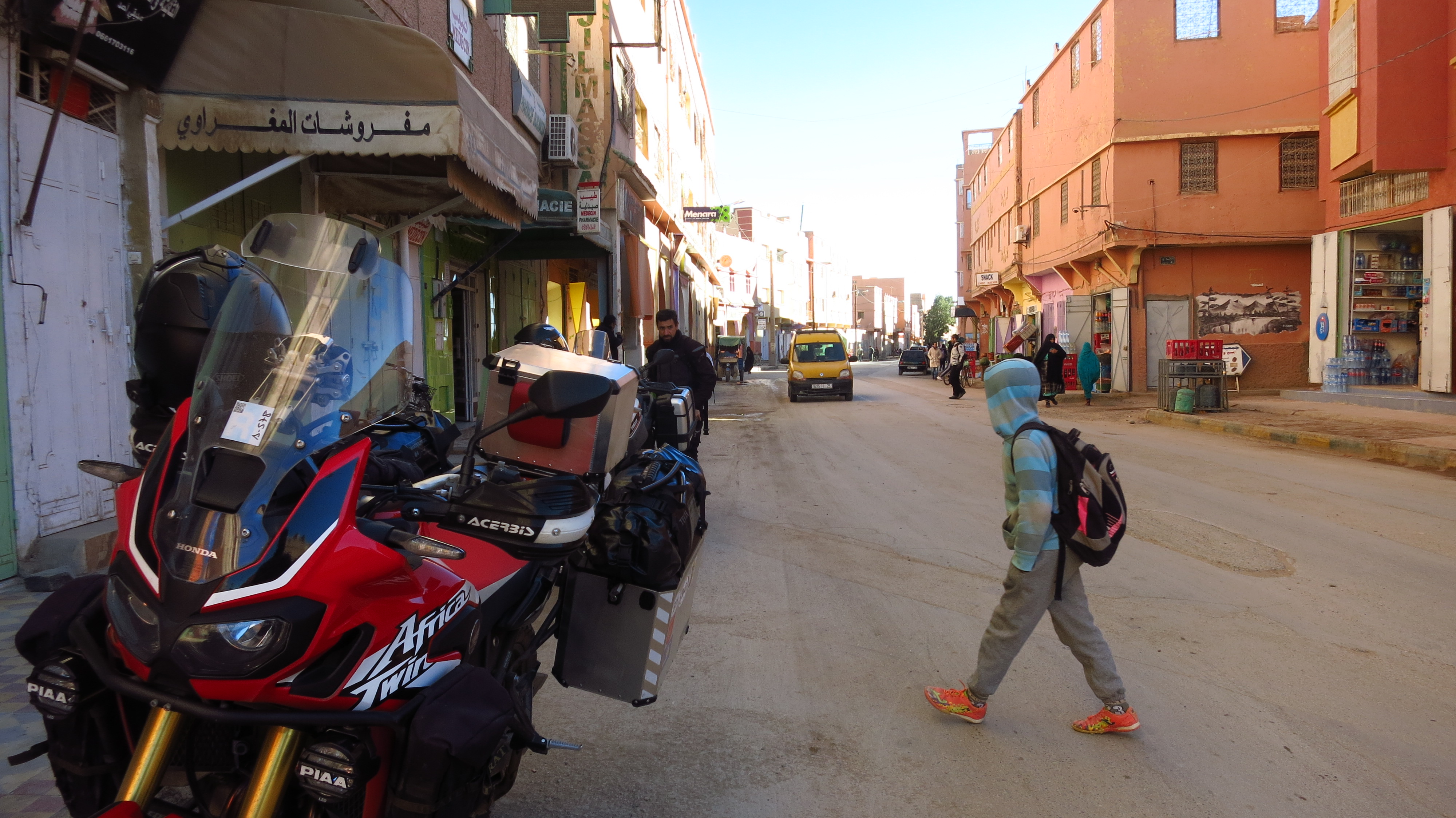 On the way down here we had taken a new road that goes straight through the desert from Erfoud to Merzouga, saving us half an hour and the hassle of crossing Rissani, but at the same time missing out on the town that had been the capital of the country in the 14thcentury and one of the many recommendations that our host in Errachidia had made – bereber pizza. However, the route to Ouarzazate took us back there, so at least we got a quick tour of the city from the bikes. We missed out on the pizza however, as the only place we found open so early in the morning told us that we would had to wait for almost an hour before we could get one to take away and we had a long day’s ride ahead of us, so we decided to move on.