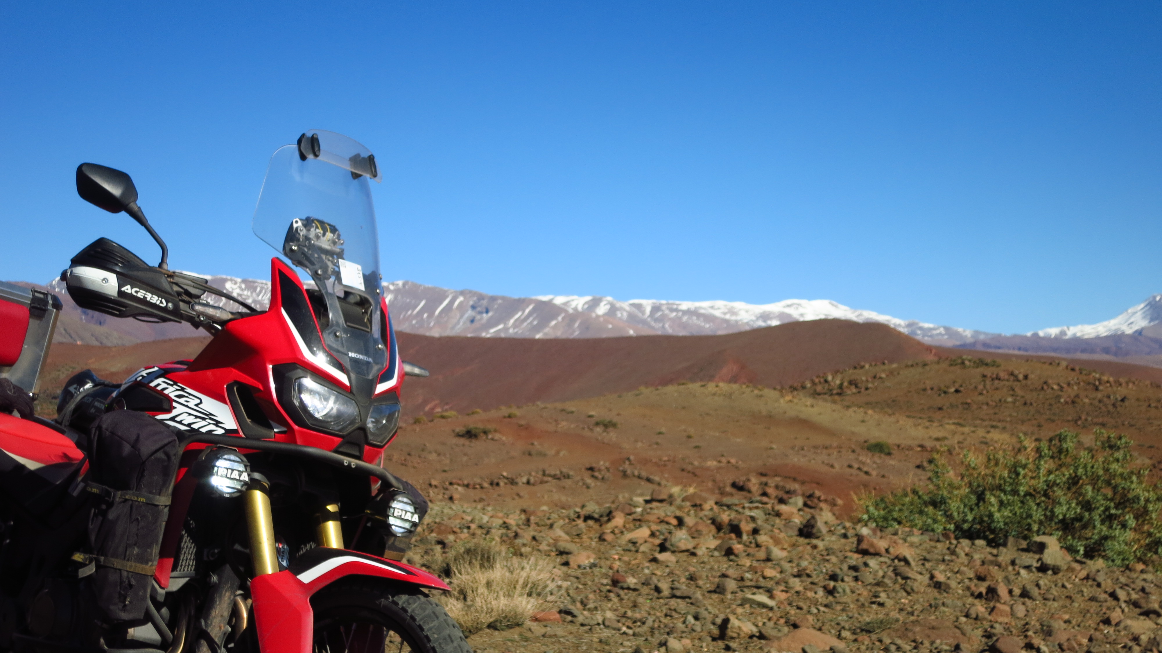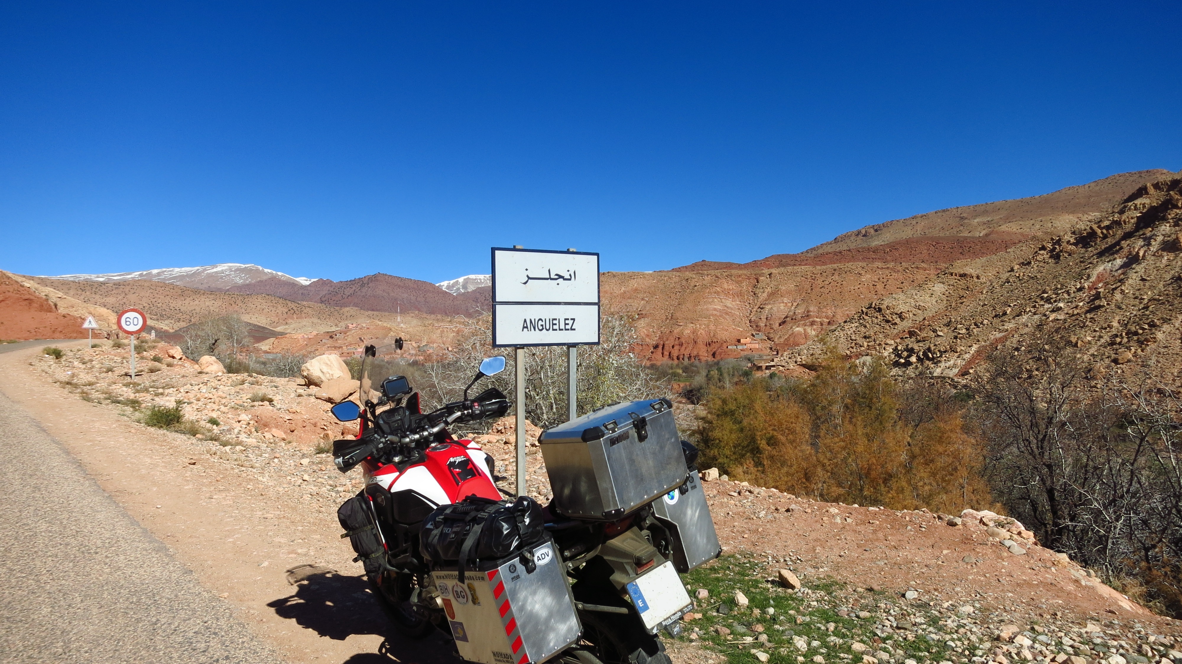 pass. In the last few days I had been sent several pictures and videos of people who were riding in different points of the Atlas mountains and general reports were of snow and cold. The usual image of a winding road against a brown rocky background had been replaced with a white blanket of snow and a thin black line of tarmac zigzagging up the mountains. Even though we had been assured that the road was a main thoroughfare across the Atlas and it was kept clear of snow, we feared that temperatures might be very low, so for the first time in the trip I rolled out the heavy artillery – winter running tights to wear underneath the riding pants, silk socks under thick wool ones, silk gloves under the regular ones and an extra layer under my fleece.