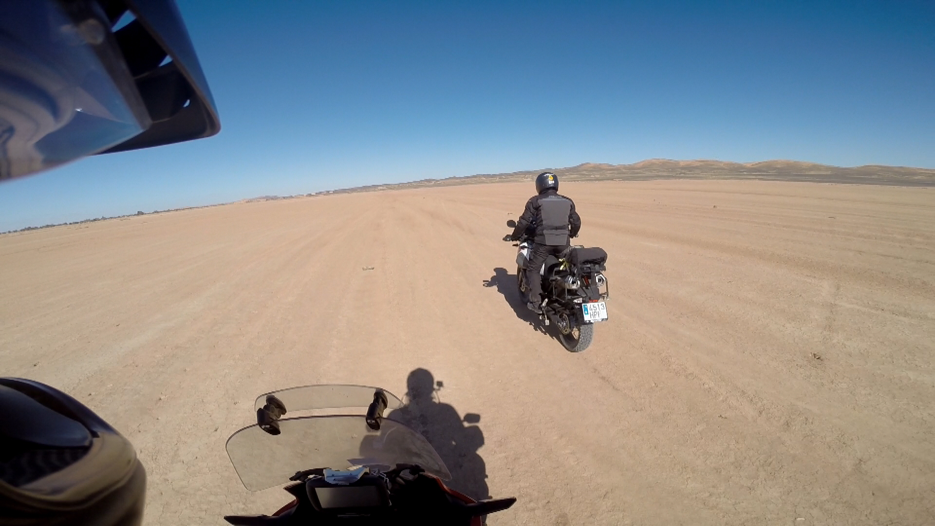 There was quite a lot of sand now, and we were getting tired. All of us had several ‘moments’ where we were about to taste some sand, but we all managed to keep the bikes upright with more or less style. We finally reached the northernmost part of the route and started heading down southwest. The ground turned harder again as we got further away from the northern tip of the Erg Chebbi, but with just a few kilometres to go, as he reached a crest Esteve hit a soft spot, his bike slipped from the back and he ended up on the ground. I opened the gas the get to him faster and help him, but he was already up and lifting his bike on his own. He had not got hurt and the only damage on his bike was a bent brake lever which we tried to straighten as much as we could to make the bike rideable again.