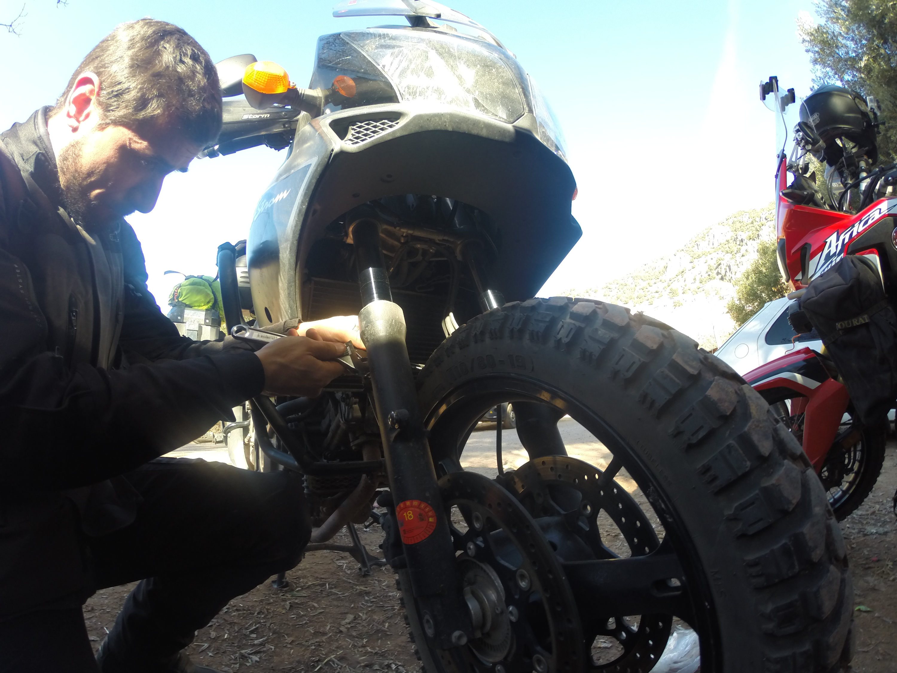 A few months ago, he had had a crash with that motorbike. It had not been a serious one, but after the bike was repaired he felt some vibrations through the handlebars and had taken it to two different mechanics who had checked the front wheel and found nothing wrong. On the way down to Morocco, however, riding alongside him on long straight stretches of road while was recording some videos, I could clearly see with my naked eye that there was something wrong with the way the wheel turned. When fixing the problem with his headlamp in Errachidia I had looked down the suspension bars from above and I would swear they were slightly bent back. The incident with the mudguard confirmed my suspicions, as it should not touch some crash bars that have been specifically designed for this bike. It was clear that the suspension had bent back slightly but far enough for the mudguard to come dangerously close to the crash bars.