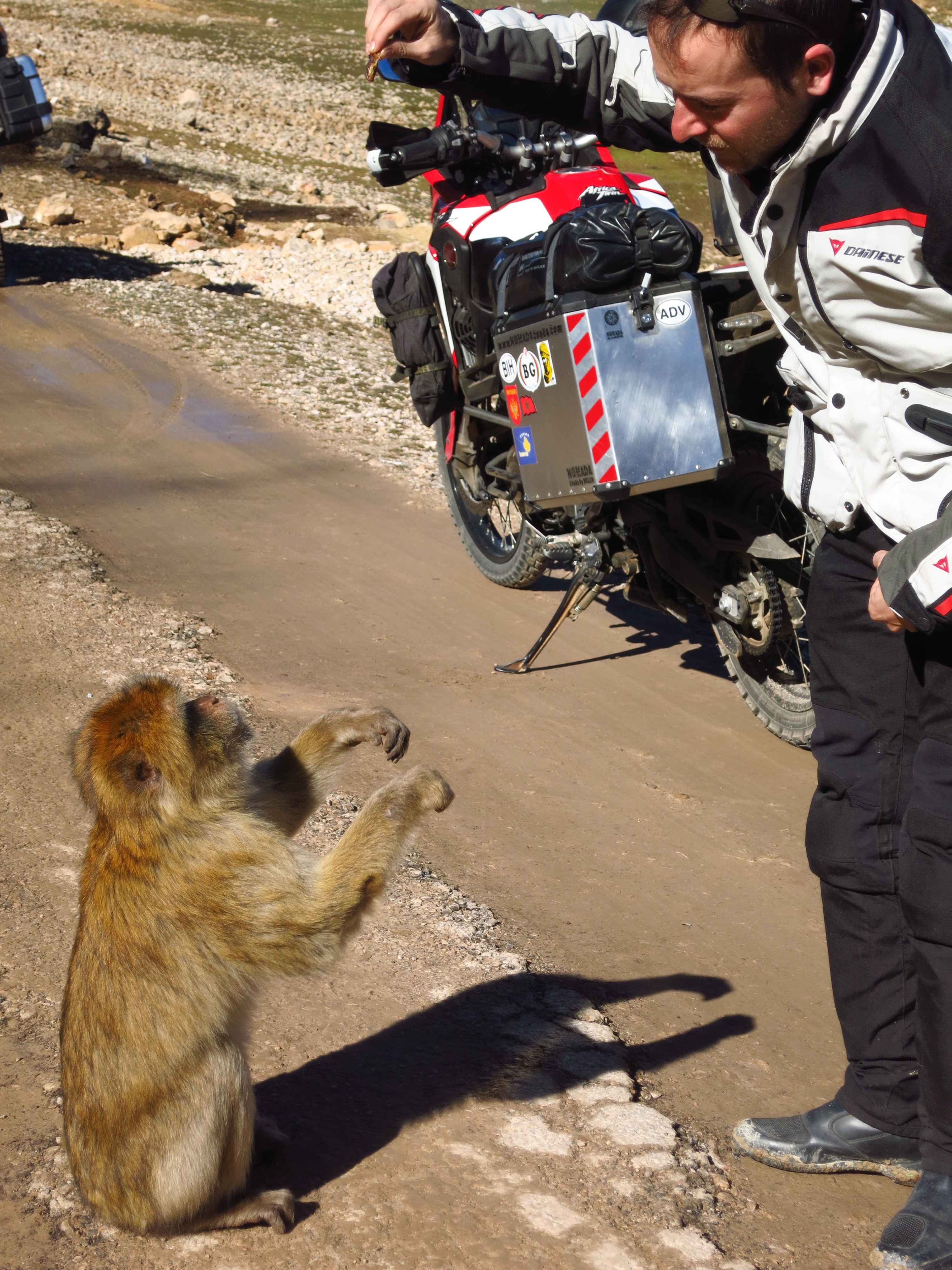 When we came back to the bikes we saw that we had a visitor. A monkey had come out of the trees and was walking around the bikes, probably looking for food. Gerard gave him some dates he had bought in Ouarzazate and when we got back on the bikes we realised that it had sat on all three of them, smearing mud all over the seats. It was a good thing that we had not left gloves, neck warmers or other stuff laying around, or he would have probably stolen it.