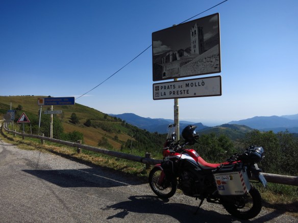 I refused to pay tolls on the motorway here, so I headed to Ripoll to cross the border in Prats de Motlló, which is a much nicer route that the one all holidaymakers take along the A7. For the first few miles I followed the exact same route I take to work every day, leaving the city amidst the tide of early Monday morning commuters, but instead of being just another anonymous road user, I noticed that people were looking at me and the bike, noticing that I was going someplace else. Once away from the big city the sun came out and I thought the weather was perfect – clear sky, getting warmer but not too much as I was gaining altitude towards the Pyrennees… I was lost in thought when I noticed a black Alfa that had pulled alongside with two beautiful girls inside. The passenger smiled at me, took a picture with her phone and gave me the thumbs up. Hell yeah!