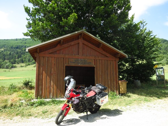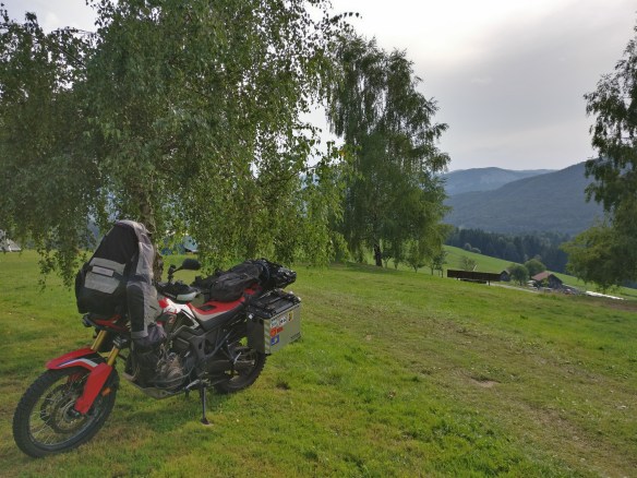 The element I had not factored in was the weather, though. So far I had been very lucky, but as I was finishing packing up and loading the bike under a lead sky, I heard the rumble of thunder coming up the valley. I was going to join Harald for breakfast before setting off, and by the time I parked the bike next to the bar it started raining hard, so we sat patiently sipping our coffees, waiting for the storm to pass. Harald said that, on account of the weather, he was going to stay for an extra day, but I had to ride in the direction the sky was darkest. The weather radar on the France Méteo app (very handy!) showed that the storm was indeed moving in the same direction I had to go, but it was advancing fast, so we guessed that in an hour or so it would have passed completely.