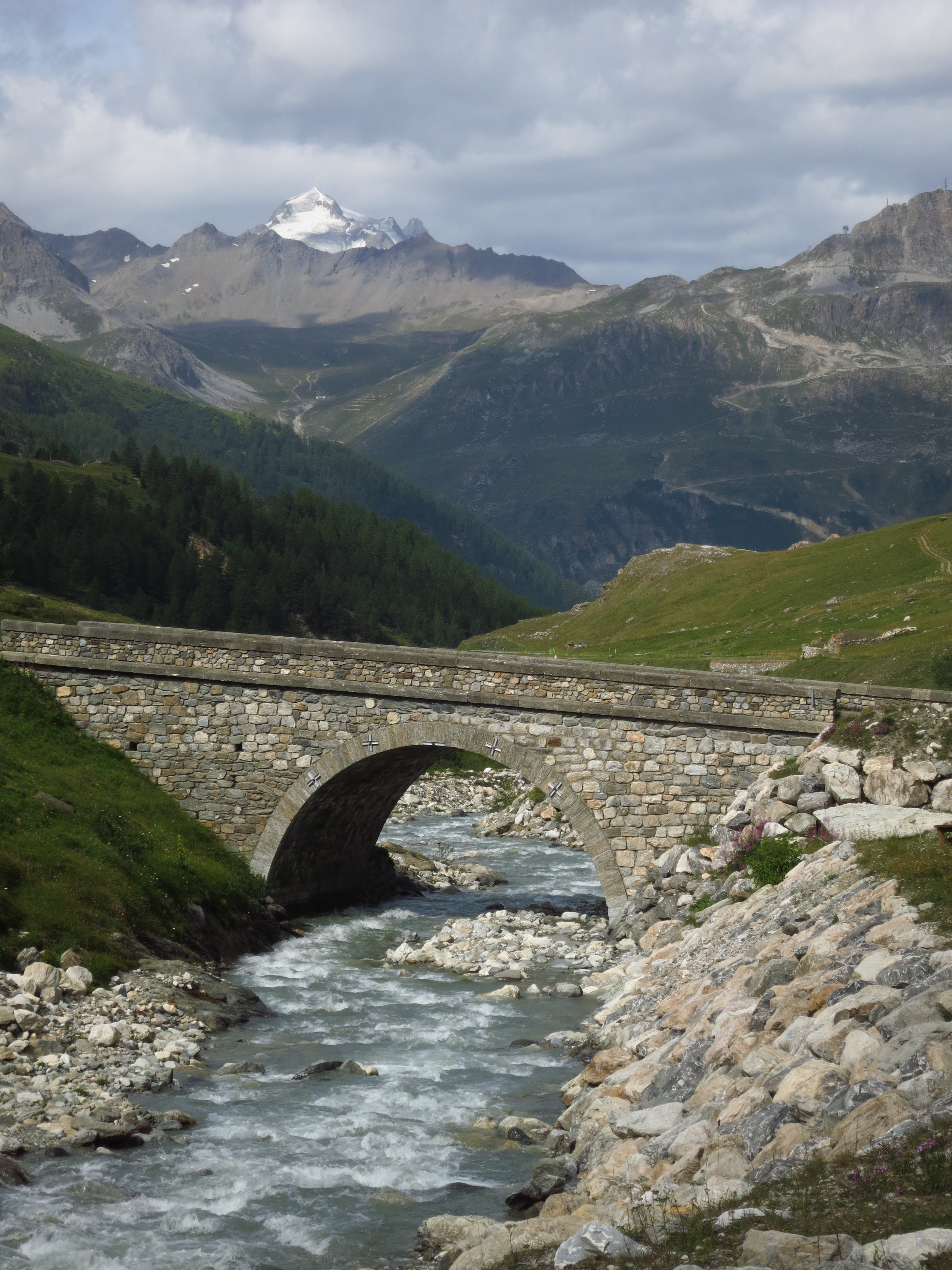 On the way down the road crosses the village of Bonneval-sur-Arc, a quaint cluster of typical alpine wooden houses that is as representative of the area architecture as it gets. Past the village the valley opens wide and the road travels through pine forests, gently losing altitude. So gently, in fact, that I almost missed the next col, one I was curious about. According to the map, it was called Col de la Madeleine, but I had already crossed a col with that name two days ago. Being a complete ignorant in Tour de France matters, I did not know which was the famous one and I wanted to compare them. This one was nothing more than a slight bump at the end of the valley before the road went down to Lanslevillard, a rather flat affair with just a road sign indicating its existence. I guess the other one is the famous one, then.