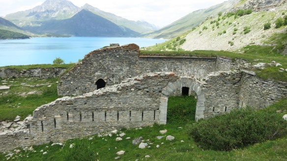Past Lanslevillard I took a small detour to the right. I had time and there was a col on one of the alternatives to the main route that I wanted to see, Col du Mont St-Cenis. I don’t know why I had decided that it was worth a detour, I did not know anything about it, maybe it was just instinct but it is definitely worth the time. The road was nice and empty, gaining altitude through a forest with some skiing slopes in it, and the col had beautiful views over the valley I had just left below but the best part was beyond the col – there is a beautiful lake with several forts along its shores. I decided to ride down to the dam and have lunch near some ruins overlooking the water, and that was how I ended up doing some unexpected bit of offroading.