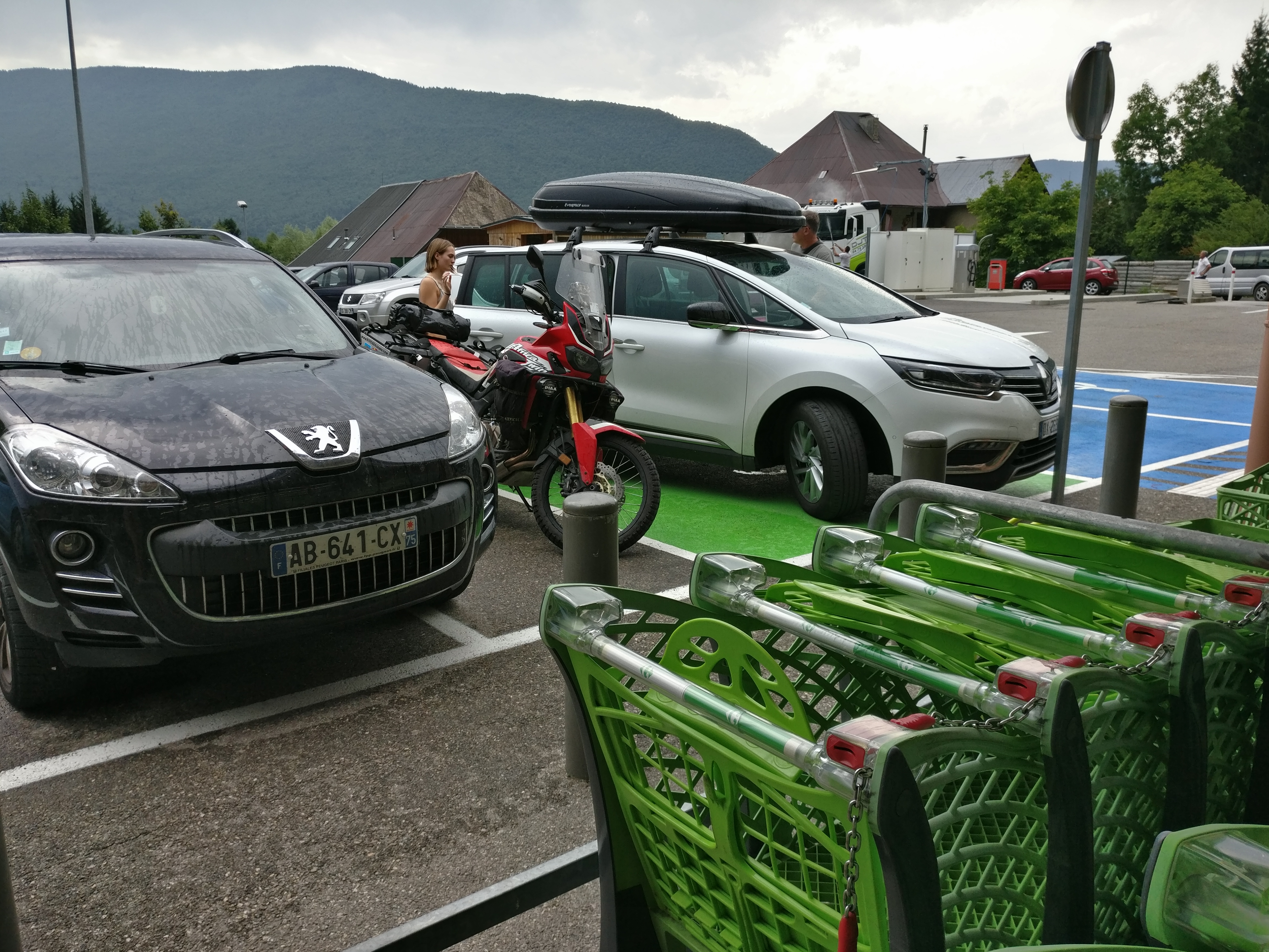 Riding the Madeleine meant a detour to Albertville and then having to ride southwest before going north to Annecy. As I was riding down I saw curtains of water in front of me – the rain I had so far been escaping was right there on my way, waiting for me. The tarmac was soaking wet, showing that this was a classic summer downpour which would get me wet in a matter of seconds. Fortunately, just before I reached the rain, the GPS told me to turn right into another valley where the sky was not so dark. It was the way up the last two passes of the day – Col de Frêne and Col de Leechau. These are part of another one of the detours on the Route des Grandes Alpes and they are on a small road with no traffic at all. After passing the Col the Frêne I stopped for petrol in a village called Le Châtelard, and no sooner had I finished filling up and was ready to leave than the skies opened and the rain that had been chasing me for the last few hours finally caught me. I took refuge under the marquee of the Carrefour supermarket next to the petrol station and waited for the rain to pass as I checked the weather radar on my mobile.