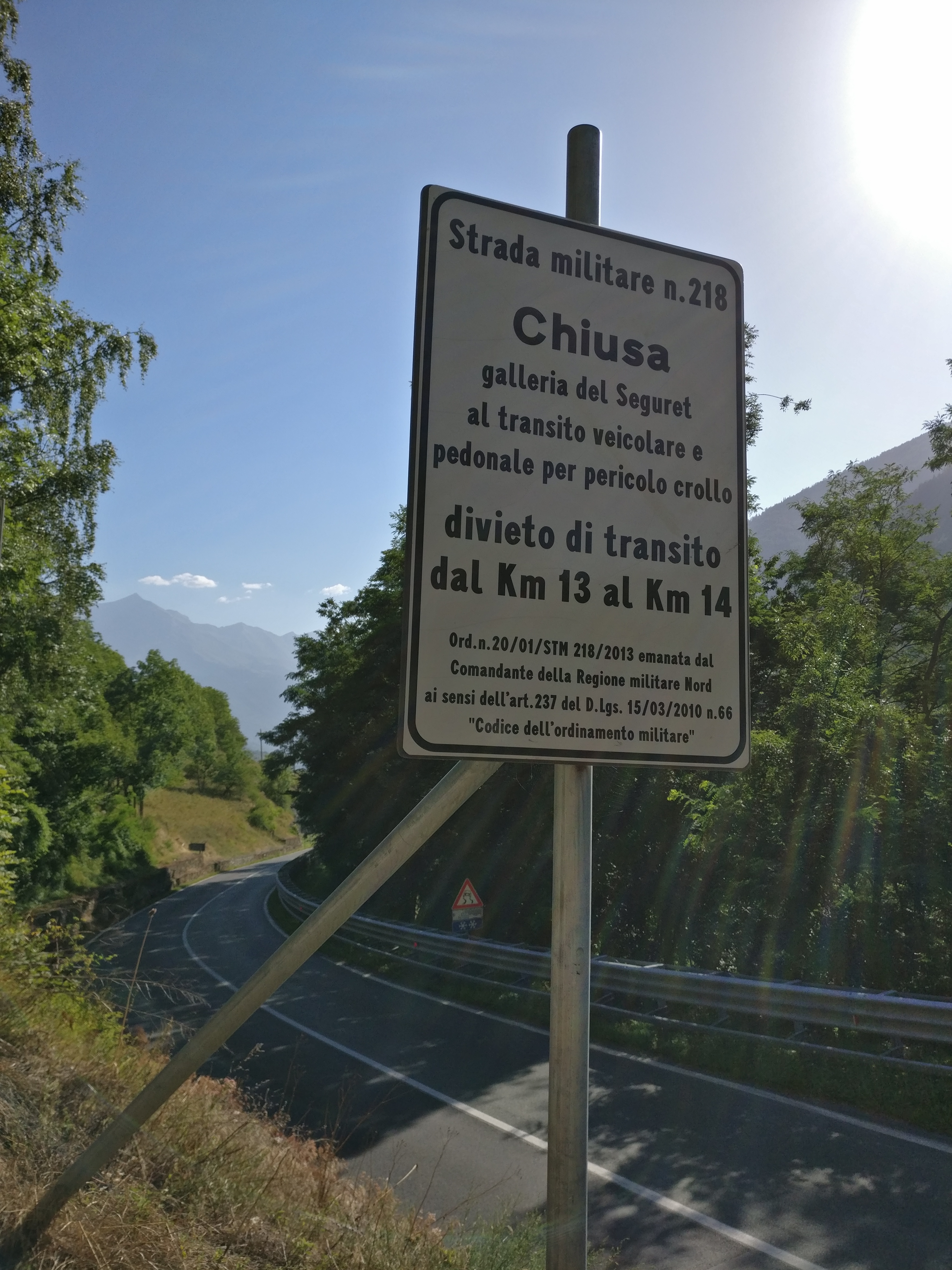 My Italian is pretty limited, but I understood that the tunnel was closed to all kinds of traffic, including pedestrians, due to risk of collapse. I was not so clear about the ‘divieto di transito’ bit between kilometres 13 and 14. Did that refer to the section that was closed? Did it mean that there was a diversion bypassing the tunnel? I had no phone signal, so I could not Google-translate it nor text my sister, who is fluent in Italian. I thought that, since I was already there, I might just as well ride up and find by myself whether the road was passable or not.
