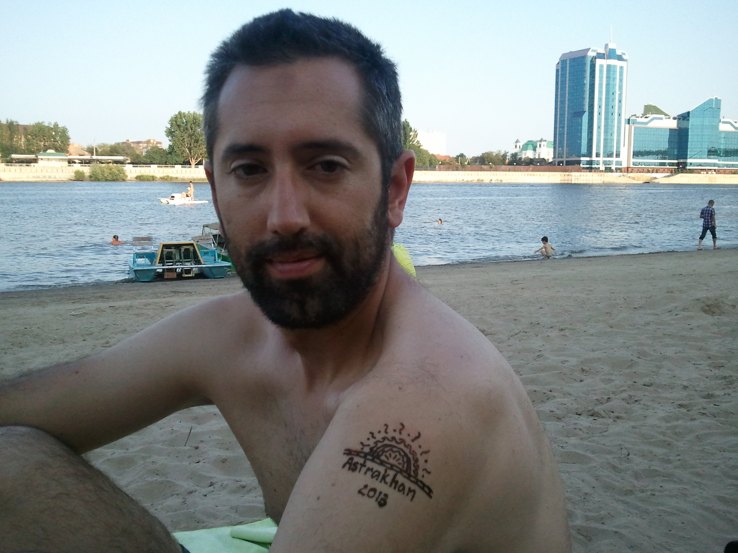 The river beach would have been a nice place if it had not been for the fact that there were empty bottles and plastic wrappings everywhere, the Russians can not seem to be able to keep a place other than their own home clean, which is a pity, as it was quite a beautiful place. I went for a swim and then Dasha took out a henna pen and started to practice drawing a tattoo on her leg. She told me that she wanted to make some extra money that summer painting tattoos on people on the beach, and when she was done she asked if she could practice on my arm too, so I got a nice souvenir from Astrakhan.