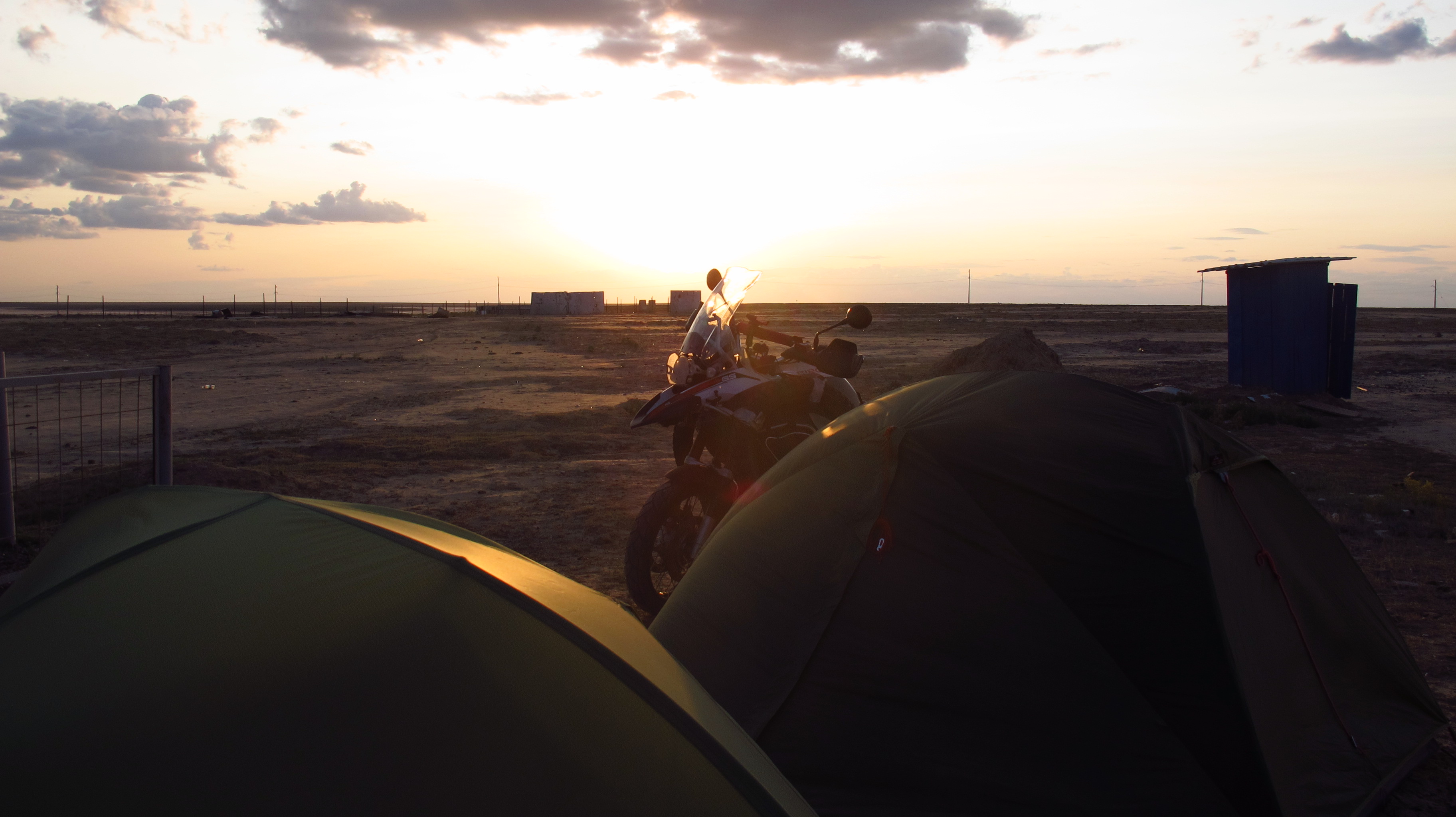 We woke up at sunrise, shortly after 5 in the morning, and by the time we had got the dust off all our stuff and packed the tents, it was already hot. As we were getting ready to leave, we asked the guy at the petrol station about the state of the roads, and he pointed at my route and said “problem, problem”. It seems that the road was in very bad condition, and people went around for 1,500km to avoid the 600km to Aktobe. I had talked to some bikers on the HUBB who had ridden it, and I thought I would take two days and try to make it.
