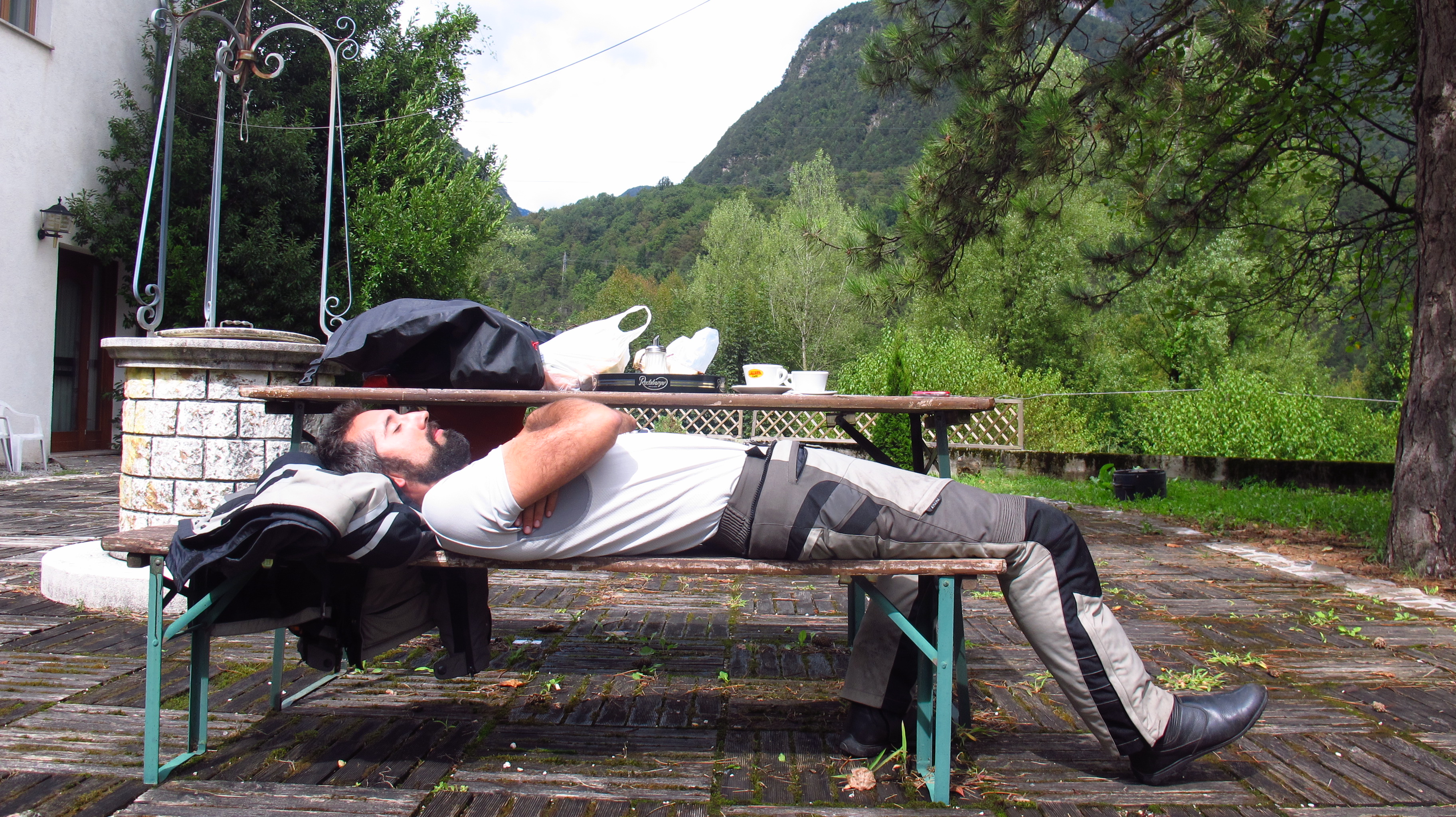 We rejoined the motorway for a while before turning left into a smaller road following the Belca river in order to avoid paying again to use Austrian roads. It would take a little longer to get to the Italian border, but it was worth it – we rode around the north face of the Triglav mountains and the scenery was breathtaking. Unfortunately the rain caught up with us right on the border, so we had to make an emergency stop to put on the waterproof gear.