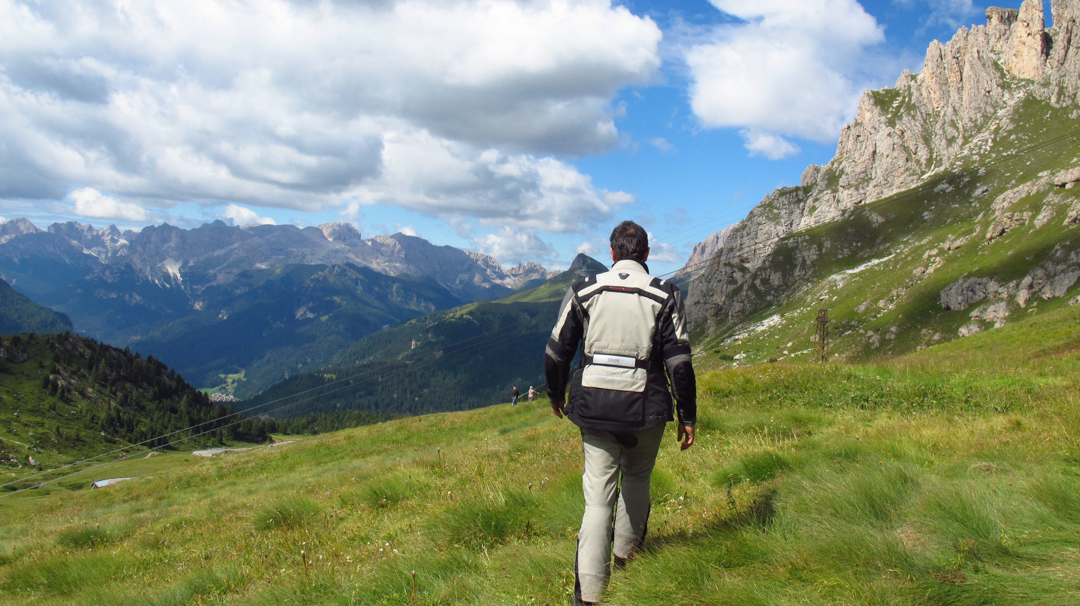 We rode out of Cortina under a glorious blue sky, my allergy all but gone, and were soon climbing a pass called Di Sella. The tarmac was in excellent condition, there was not much traffic aside from other bikes and the road wound its way up the pass through lush fields of green, a combination of fast corners at the bottom and hairpins at the top. It was here that I saw for the first time that Italians number the corners on their mountain passes, so can count how many you have to go.