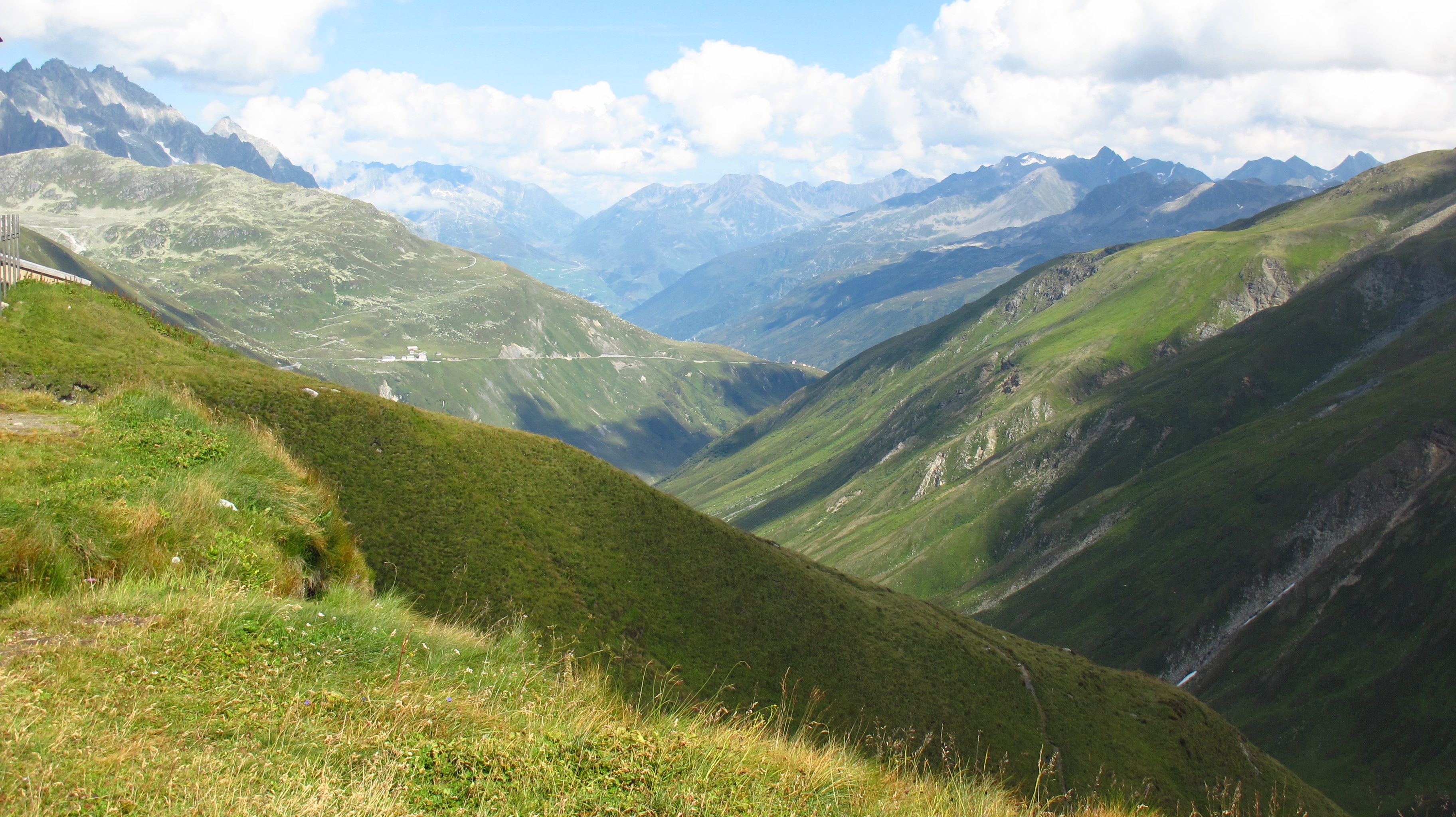 The road took us down a deep valley where we saw an old train station where the line coming from the valley ended and passengers switched to the old steam trains for the reminder of the way up. The road down from the top of the Furkapass kept crossing the train line, and once at the bottom it almost immediately started climbing again for the Grimselpass, the last one before Interlaken. From the beginning of the last section of the Furkapass we got a privileged view encompassing the railway going down to the bottom of the valley, the station, the road up the next pass and even a glimpse of the lake at the top of it, all in glorious late afternoon light. We went past another lake on the way down from the Furkapass, on a road that offered yet more gorgeous views for what was the last bit of our ride in the heart of the Alps.