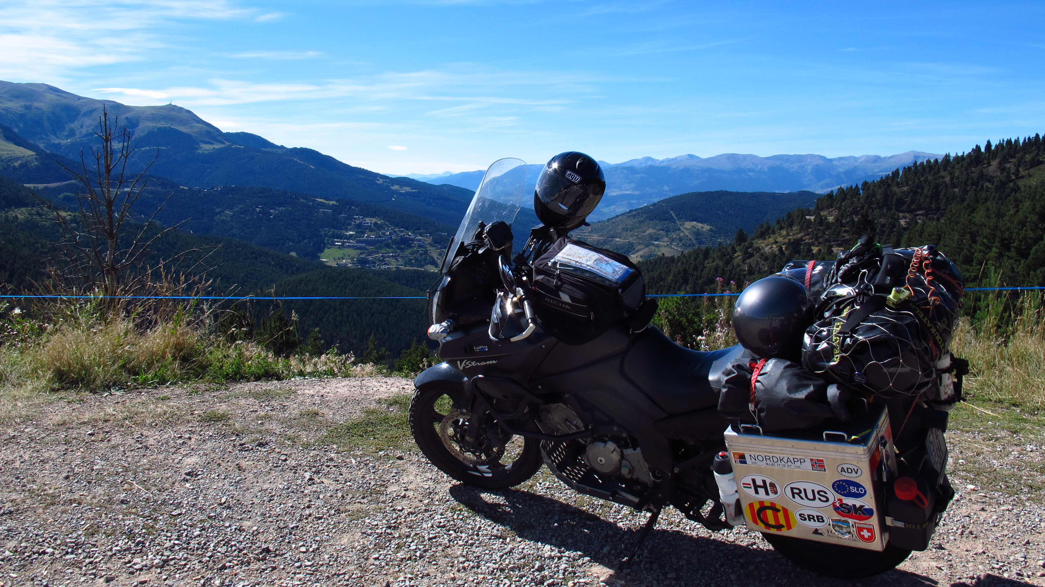 I finally made it to Perpignan, where I wanted to turn west and head for the Pyrenees. It was already lunchtime, so by the time I had left the big town and the industrial parks that surrounded it behind I started looking for a place to eat. I wanted to find a nice small town restaurant and enjoy one last meal on the road, but it was not to be. I wonder if it was a national holiday or the French simply do not like to work on Mondays, but I did not manage to find a single thing open in the towns and villages I rode through. I also needed to fill up again, so I was heading to a supermarket petrol station I had found on the GPS, and since I had not seen an open restaurant or bar, I thought I would buy something there and just find a nice spot by the road now that I was closer to the mountains. That option was quickly discarded as I rode onto the supermarket car park. Not a soul in sight, all shutters down and only a couple of credit card-operated petrol pumps in the scorching sun to greet me. I filled up, and as I was still wearing the inner lining in the jacket and pants –it was cold in the morning- I started to take them off without even pushing the bike away from the pump. Sure enough, as I was in the middle of my striptease, not one, but three cars, a motorbike and a guy on foot carrying a jerrycan turned up to use the damn pump. Where did they come from!? I had ridden across the whole town and it was completely deserted! I moved the bike away and finished changing clothes while a middle-aged mademoiselle tested the other four people’s patience by taking her own sweet time to figure out how to use her card to pay for the petrol.